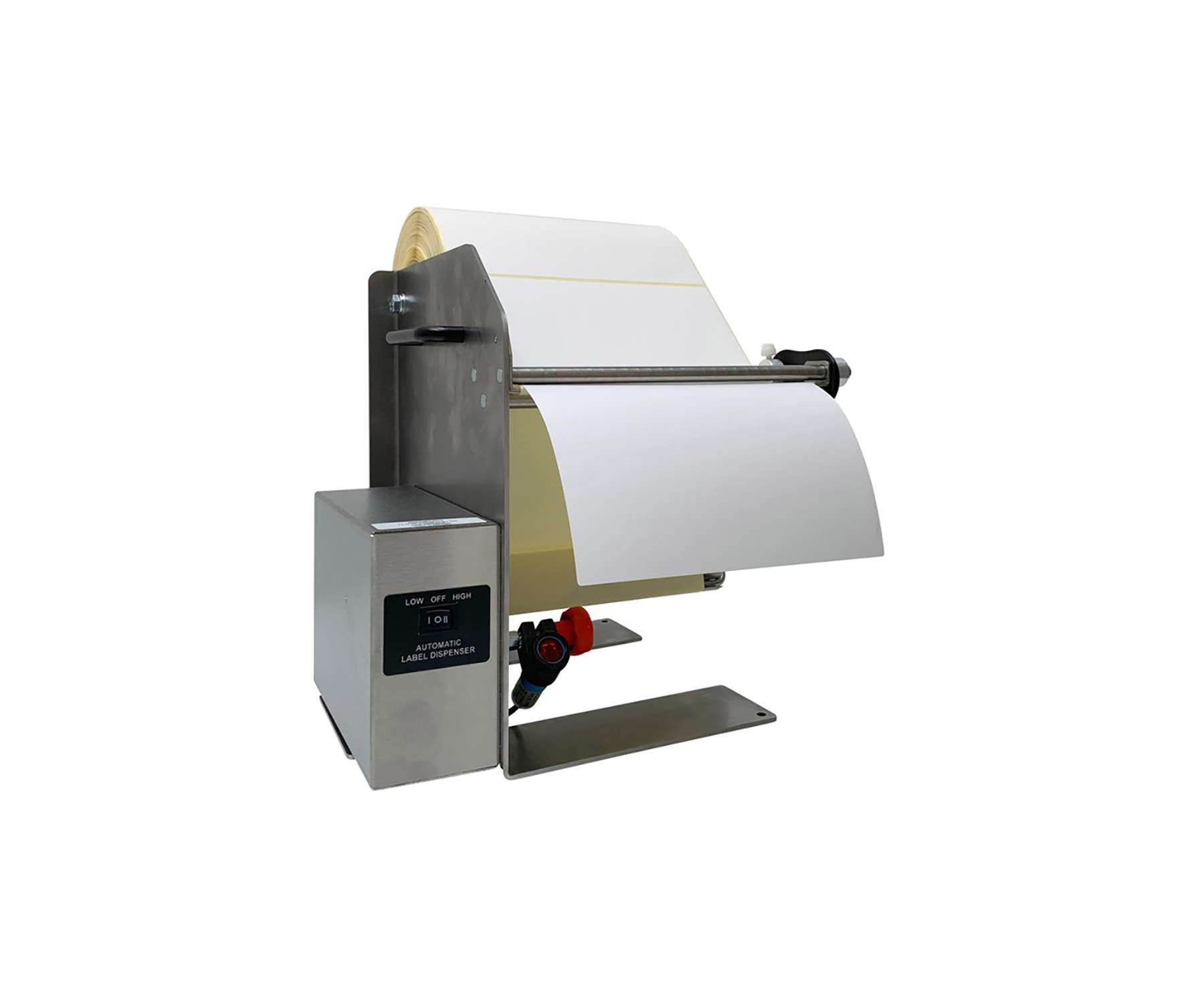 The LD-300-U-SS uses a peel and present design with the latest photoelectric sensor technology to dispense all types of labels. A special reflective sensor sits below the label and reliably senses the leading edge of you label. As the operator picks up a label, the next one is automatically and instantly advanced.