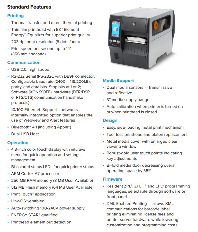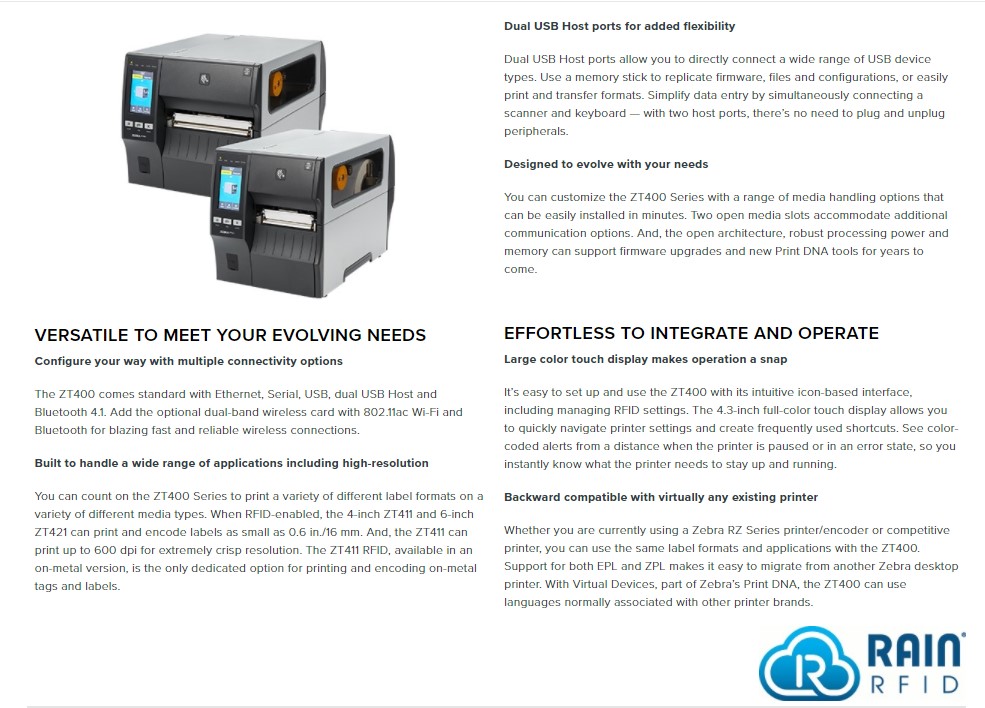 The ZT411 RFID printer/encoder features a 4.3-inch full-colour touch display to see status at a glance. With a print width of 4 inches and print speeds of up to 14 inches per second, it also offers high-resolution (600 dpi) printing and adaptive encoding technology for excellent media flexibility and simple RFID calibration. Add Zebra’s exclusive on-metal tagging solution*, which is the only dedicated option for printing and encoding thicker RFID labels for metal containers and assets.